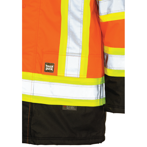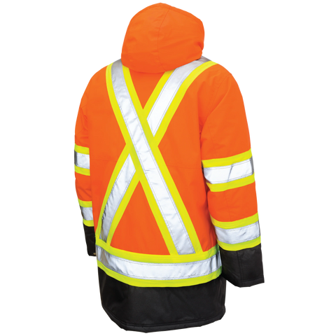 The safety parka for those on a road crew or a construction site. Equipped with a quick-release hood that effortlessly accommodates hard hats, to stay protected while on the move, repelling water and enduring the toughest conditions. Its insulation lining guarantees superior warmth, while the reflective material ensures high visibility in low-light situations, enhancing safety on the job. With ample storage, including chest and lower pockets, to keep essentials close at hand.