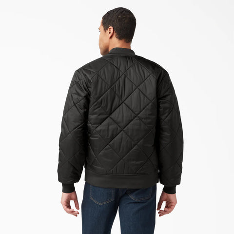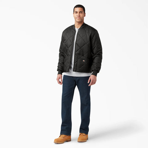 Stay warm, stay protected. This Diamond Quilted jacket is well-equipped with water-resistant material that fends off the elements so you can focus on work, not the weather. Plus, the handwarmer pockets and ribbed construction help lock the heat in with a relaxed fit.